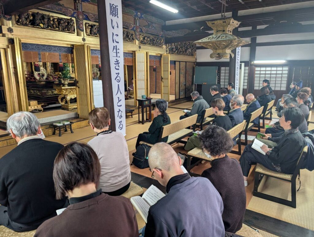 本堂では皆様にお経本をお配りし、仏説阿弥陀経を共にお勤めしました。皆様もしっかりとお経本を見ながらお勤めをされました。