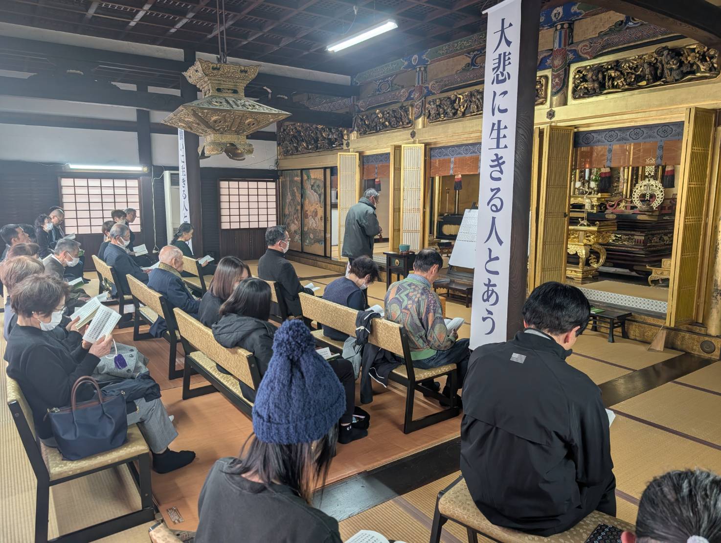 本堂では皆様にお経本をお配りし、仏説阿弥陀経を共にお勤めしました。皆様もしっかりとお経本を見ながらお勤めをされました。